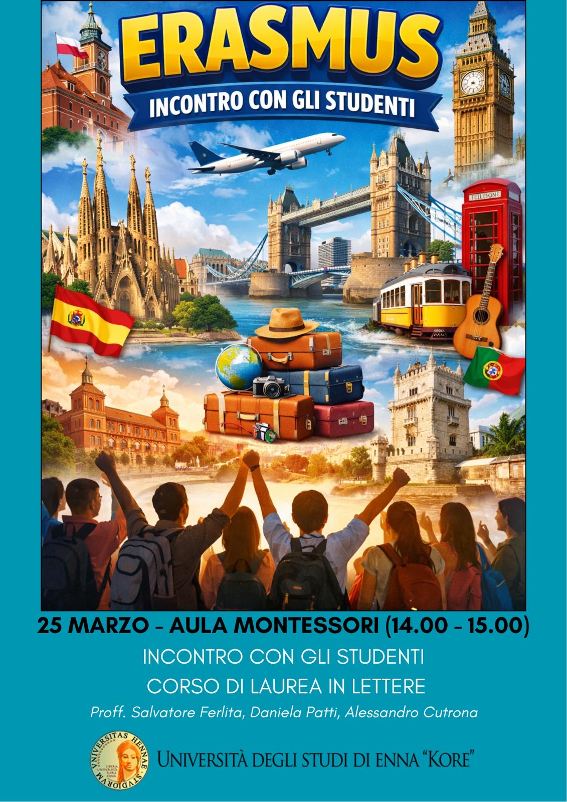 Mercoledì 25 marzo, alle ore 14:00, si terrà un incontro di orientamento sul progetto Erasmus, rivolto agli studenti del corso di laurea di Lettere di tutte le annualità.