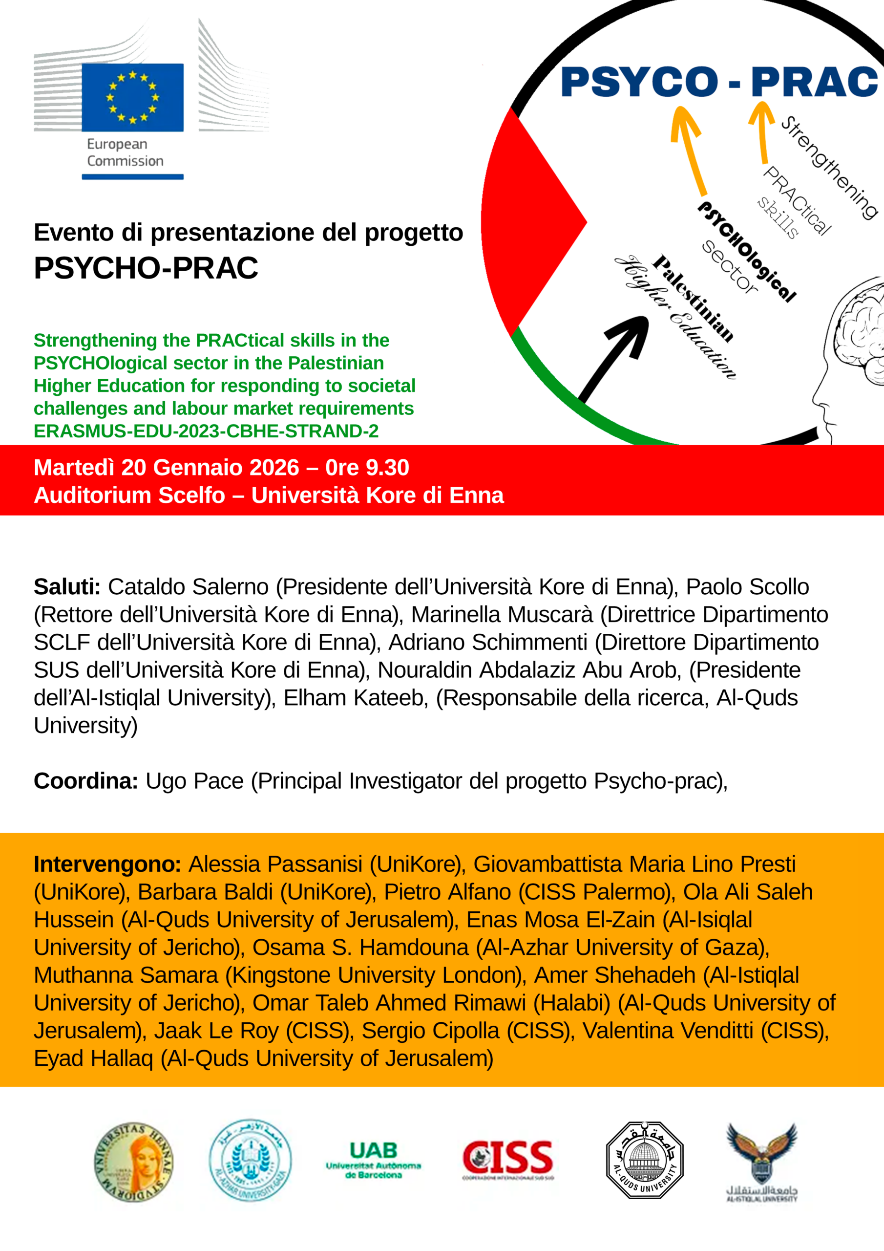 Dalla Sicilia arriva un segnale forte e chiaro: l’università non è soltanto un presidio di formazione, ma può diventare un attore capace di incidere sulla vita delle comunità più fragili del Mediterraneo. Con un finanziamento europeo di 710.000 euro, prende forma il progetto PSYCHO-PRAC – Strengthening the PRACtical skills in the PSYCHOlogical sector in the PalestinianHigher Education, un’iniziativa che vede l’Università Kore di Enna nel ruolo di capofila e il Prof. Ugo Pace come coordinatore scientifico.