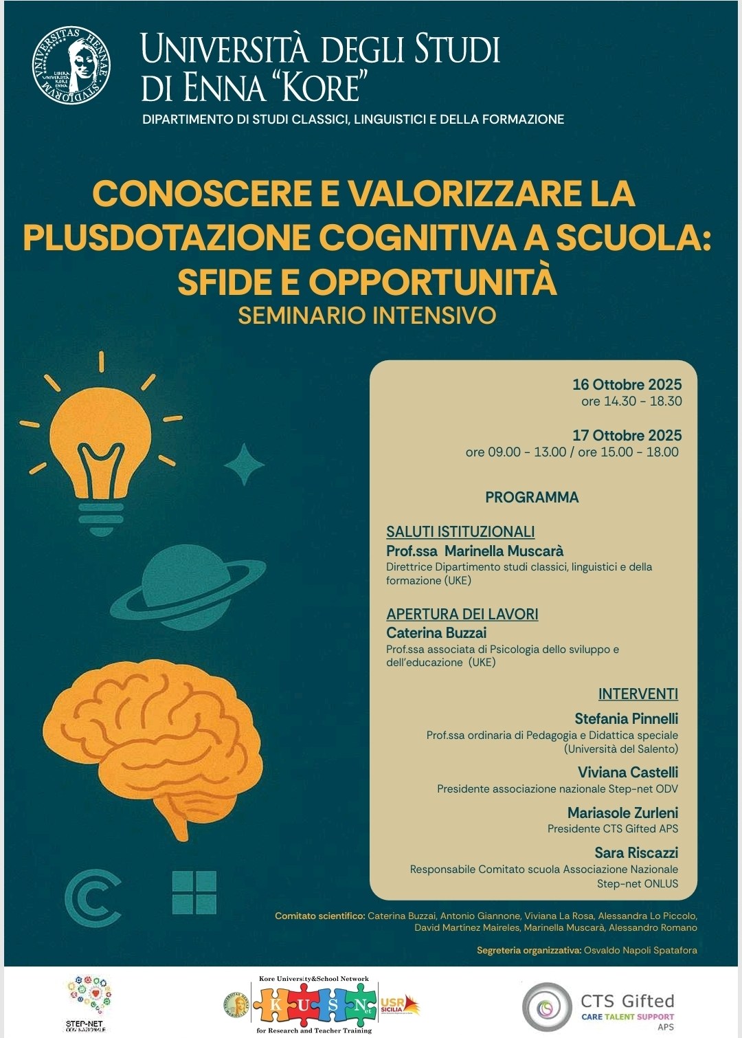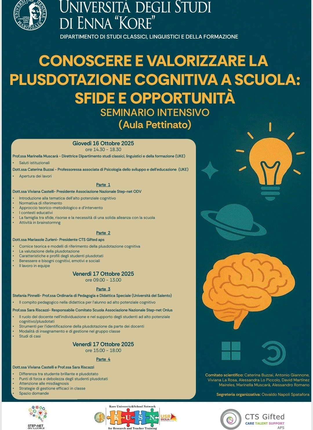 Giovedì 16 ottobre 2025, dalle ore 14.30 alle ore 18.30 e venerdì 17 ottobre 2025, dalle ore 09.00 alle ore 13.00 e dalle ore 15.00 alle ore 18.00, presso l'Auditorium G. Pettinato del Dipartimento di Studi Classici, Linguistici e della Formazione si svolgerà il seminario intensivo dal titolo "Conoscere e valorizzare la plusdotazione cognitiva a scuola: sfide e opportunità". È prevista l’ammissione dei primi 30 studenti che, in ordine cronologico di prenotazione, avranno perfezionato la procedura di registrazione entro le ore 13.00 del giorno 12 ottobre 2025. La partecipazione è riservata agli studenti iscritti al quarto e quinto anno del corso di laurea in Scienze della Formazione Primaria.