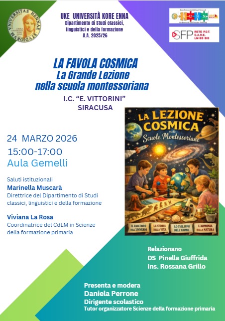 Martedì 24 marzo 2026, presso l'aula Gemelli del Dipartimento di Studi Classici, Linguistici e della Formazione, dalle ore 15:00 alle ore 17:00 si svolgerà il seminario " La Favola cosmica. La grande lezione nella scuola montessoriana", tenuto dalla DS Pinella Giuffrida e dalla docente Rossana Grillo - Istituto comprensivo "E. Vittorini" di Siracusa (SR).