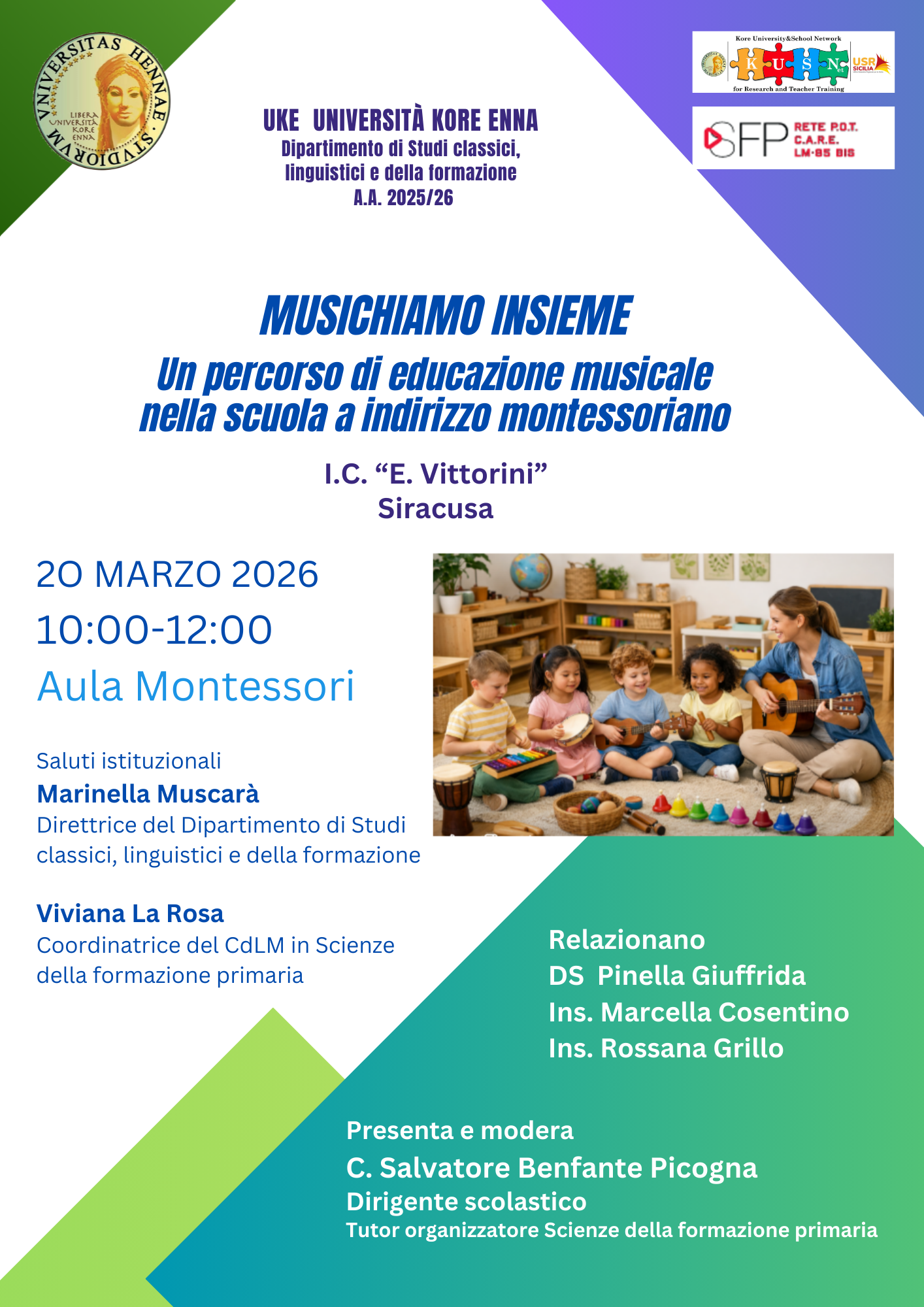 Venerdì 20 marzo 2026, presso l'aula Montessori del Dipartimento di Studi Classici, Linguistici e della Formazione, dalle ore 10:00 alle ore 12:00 si svolgerà il seminario "Musichiamo insieme. Un percorso di educazione musicale nella scuola a indirizzo montessoriano" tenuto dalla DS Maria Pinella Giuffrida e dalle docenti Marcella Cosentino e Rossana Grillo - Istituto comprensivo "E. Vittorini di Siracusa.