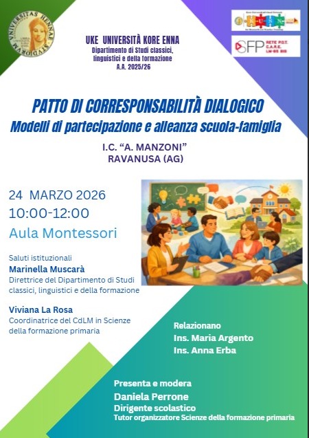 Martedì 24 marzo 2026, presso l'aula Montessori del Dipartimento di Studi Classici, Linguistici e della Formazione, dalle ore 10:00 alle ore 12:00 si svolgerà il seminario "Patto di corresponsabilità dialogico. Modelli di partecipazione e alleanza scuola-famiglia", tenuto dai docenti Maria Argento e Anna Erba - Istituto comprensivo "A. Manzoni" di Ravanusa (AG).