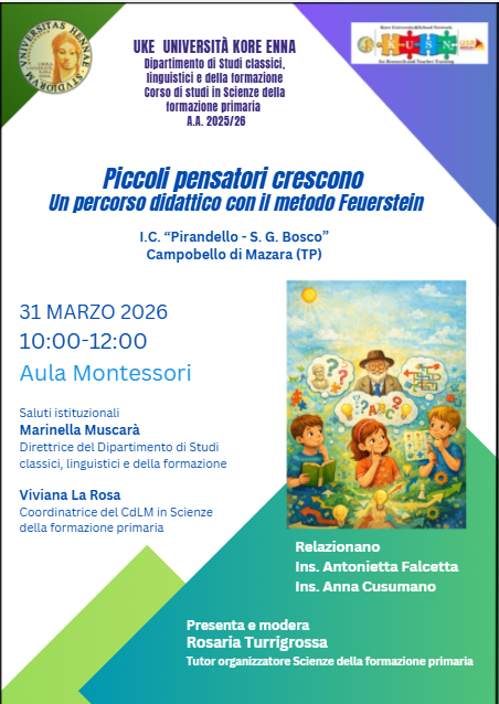 Martedì 31 marzo 2026, presso l'aula Montessori del Dipartimento di Studi Classici, Linguistici e della Formazione, dalle ore 10:00 alle ore 12:00 si svolgerà il seminario dal titolo "Piccoli pensatori crescono. Un percorso didattico con il metodo Feuerstein" tenuto da docenti Antonietta Falcetta ed Anna Cusumano - Istituto comprensivo "Pirandello - S.G. Bosco Capuana" Campobello di Mazara (TP).