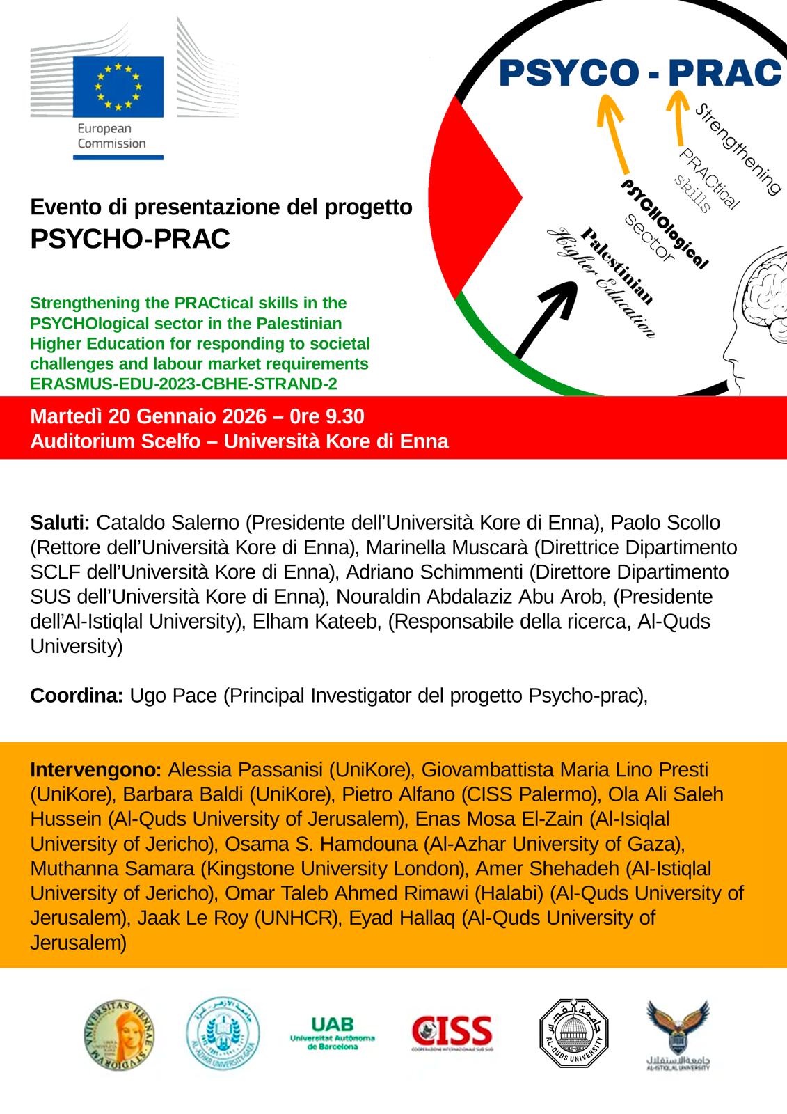 Martedì 20 gennaio 2026, dalle ore 09.30 alle ore 13.00, presso l'Auditorium "A. Scelfo" dell'Università degli Studi di Enna, si svolgerà la presentazione del progetto Erasmus + "PSYCHO-PRAC Strengthening the PRACtical skills in the PSYCHOlogical sector in the Palestinian Higher Education for responding to societal challenges and labour market requirements" .