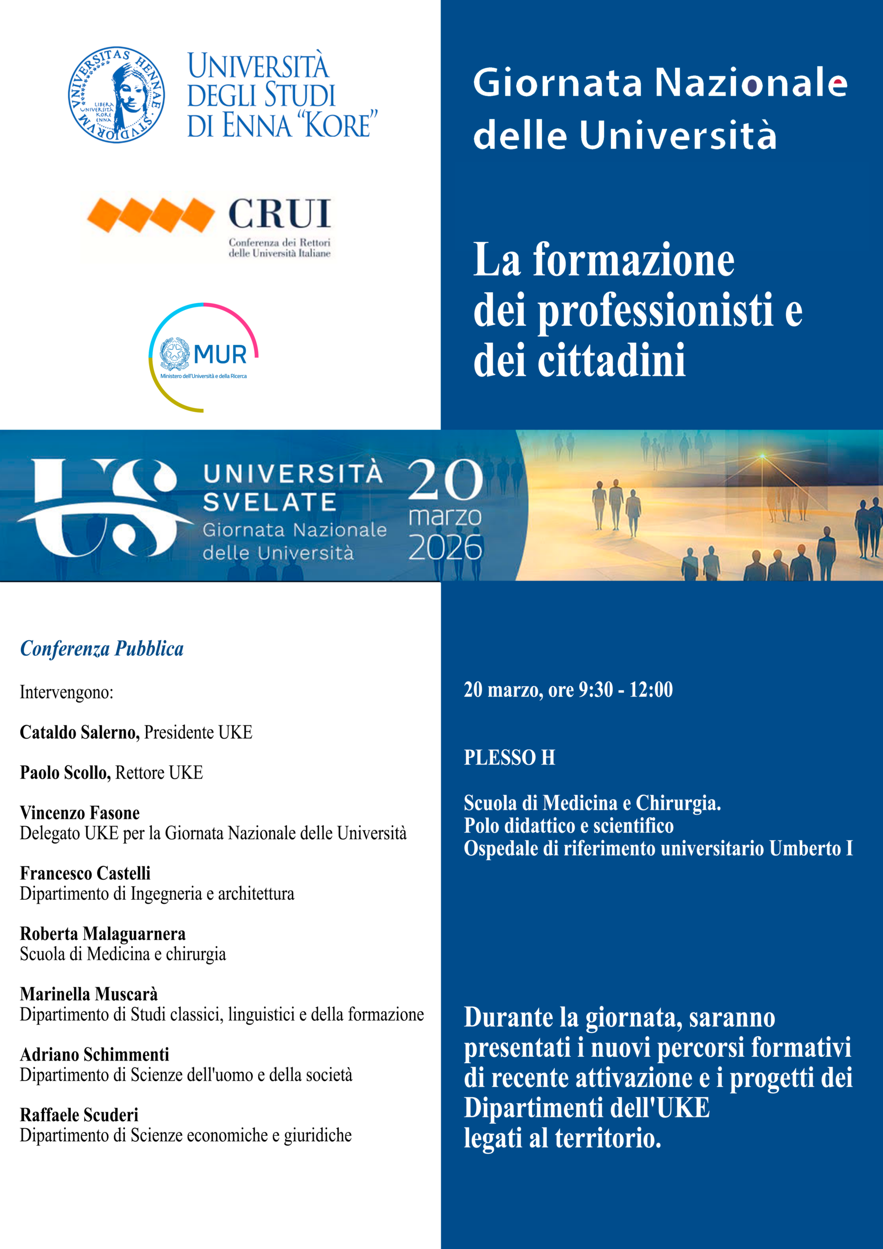 In questo contesto, l’Università Kore di Enna partecipa all’iniziativa organizzando una conferenza pubblica dedicata al tema della formazione dei professionisti e dei cittadini, con l’intento di favorire un momento di riflessione e confronto sul ruolo dell’università nella crescita culturale, civile e professionale della comunità.